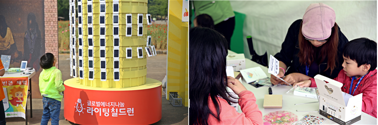 시민들은 이번 행사에서 자전거를 타면서 전달되는 동력에너지를 이용한 비누방울만들기와 햇빛을 이용한 선풍기 돌리기 등 자가발전을 체험해 볼 수 있었고 에너지 절약과 나눔에 대한 약속을 퍼즐판에 붙이기도 하는 등 에너지 절약에 대한 인식을 높이는 다채로운 행사에 참여하였습니다.