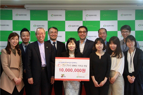 지난 5월 11일(월), 여성,남성 의류 제조 및 판매 전문기업 ㈜올레 인터내셔널은 17주년 창립기념일을 맞아 장애인을 위해 사용해 달라며 밀알복지재단에 천만 원을 기부해 왔습니다.