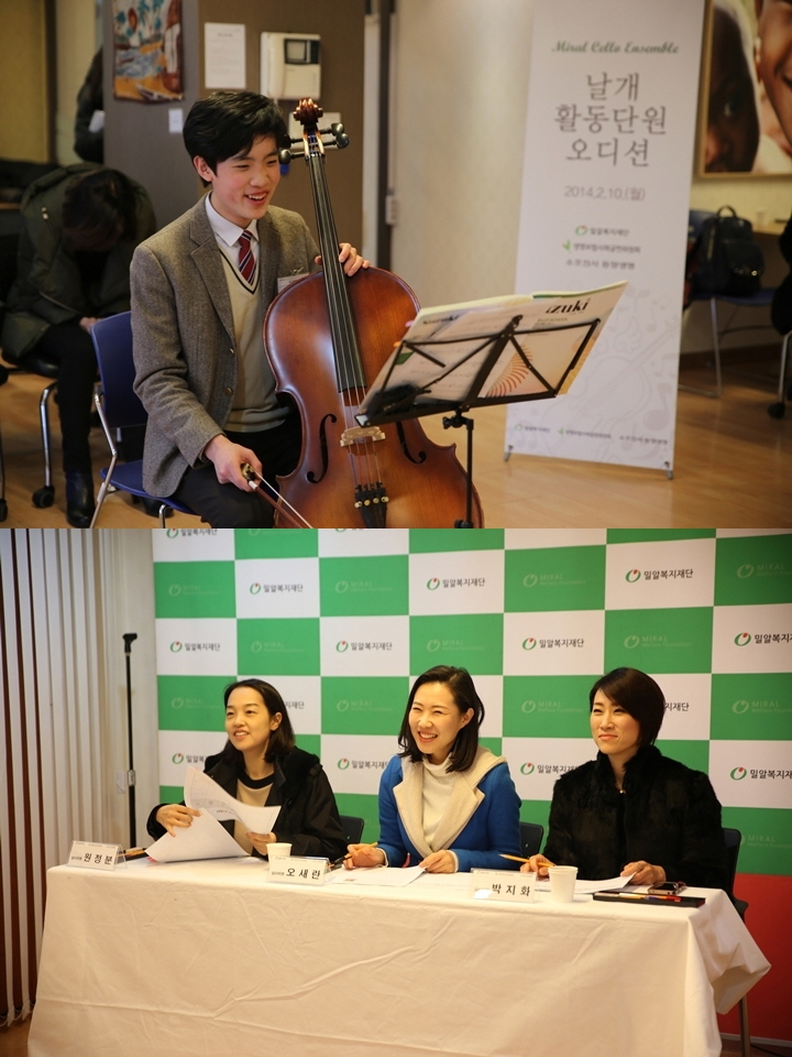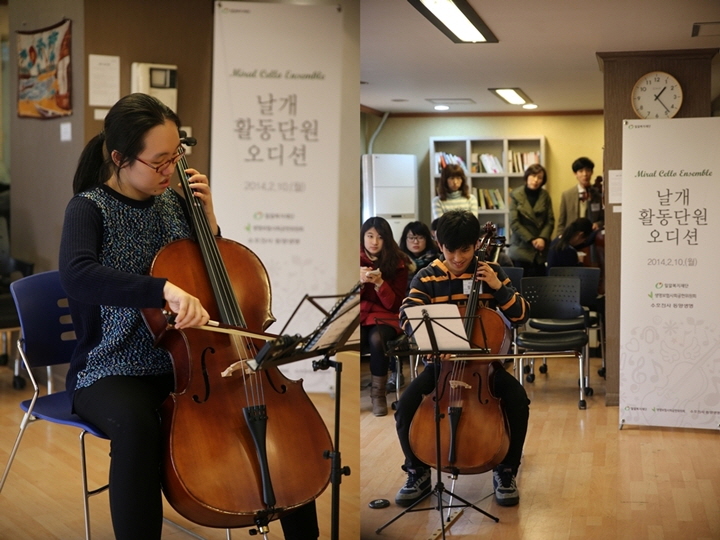 밀알첼로앙상블 '날개'는 음악을 통해 발달장애청소년들이 당당한 모습으로 사회와 소통하는 방법을 배우고, 장애인에 대한 인식을 개선하는 것을 목표로 201211월 활동을 시작했습니다. 이번 오디션을 통해 발달장애청소년들이 첼로를 연주하며 본인의 강점을 발견하고 이를 발전시켜 예술가로 성장할 수 있는 기회를 얻게 됩니다. 오디션에서 지원자들은 첼로 자유곡 한곡과 지정곡 한곡을 연주했고, 그밖에 리코더 등으로 자신의 재능을 표현했습니다.