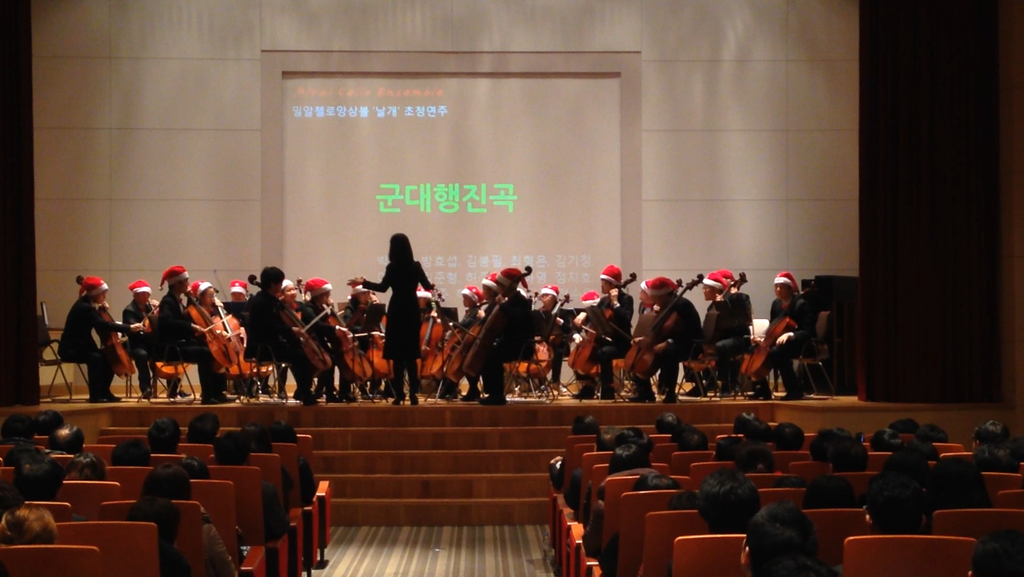 밀알첼로앙상블 날개는 1219일 연말 송년회를 가짐으로 2013년 한 해를 마무리 할 예정이며, 2014년에는 실력향상을 위해 연습에 매진하여 첼리스트의 면모를 보이고자 더욱 노력할 예정입니다. 앞으로 펼쳐질 밀알첼로앙상블 단원들의 끝없는 도전에 많은 응원 부탁드립니다