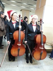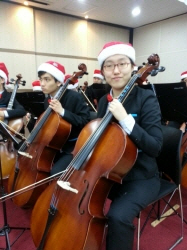 밀알첼로앙상블 단원들은 연말을 맞아 산타모자와 빨간 보타이를 매고 멋진 연주를 선보였습니다