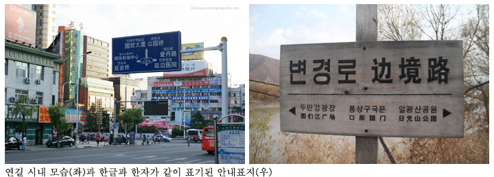 북한과 중국 경계부근에 위치한 연길(Yanji)은 지역인구의 40%가량이 조선족으로 조선족 문화의 중심지라 할 수 있는 도시입니다. 19세기부터 일제강점기에 이르기까지 한반도 북녘의 주민들이 삶의 터전을 찾아 연변지역에 이주하여 살게 되면서 지금은 중국에서 조선족이 가장 많이 사는 지역으로 자리 잡았습니다. 연길 시내를 지나가다 보면 어렵지 않게 조선어로 이야기하는 사람들을 만날 수 있고, 대부분 상점 간판들이 한어(한문)와 조선어(한글)가 동시에 표기되어 있는 모습을 볼 수 있습니다. 이러한 모습들은 현지 정부에서 소수민족 문화보전을 장려하는 정책에서 비롯되었다고 합니다.