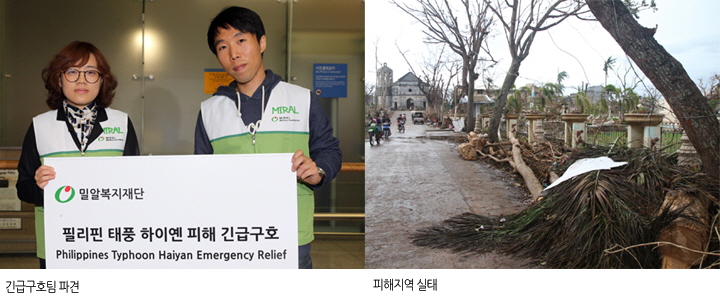 태풍 하이옌으로 큰 피해를 입은 필리핀 지원 및 복구를 위해 밀알복지재단에서 긴급구호팀을 파견했다. 이번 태풍의 피해로 타클로반 공항은 파괴됐고, 많은 도로가 폐쇄됐으며 통신상태도 열악한 상황이다. 현지 언론은 사상 최악의 태풍인 하이옌으로 인해 약 1만 여명의 주민들이 사망했다고 보도했다.