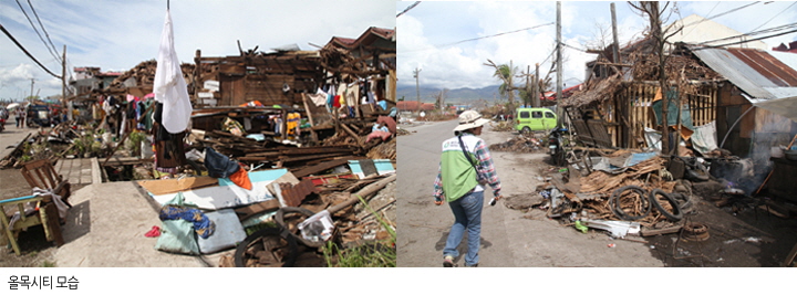 하이옌(Haiyan)의 직격탄을 맞은 필리핀 중남부 레이테 섬 올목시티. 간헐적으로 지붕만 날아간 집은 기적과 같았다. 타클로반에서 2시간 정도 떨어진 올목시티의 상황 역시 심각했다. 80~90%의 가구들 대부분이 지붕은 날아가고, 벽은 무너져 있었다.