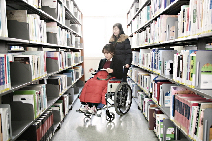 도서관의 대부분의 공간은 휠체어로 이동이 편리한 편이었습니다. 엘리베이터로 각 층을 이동할 수도 있고 열람실이 위치한 3동을 제외한 1,2동 및 식당 등 편의시설을 모두 이용할 수 있었습니다. 다만 도서관으로 들어서는 입구가 급한 경사로라는 점, 1동에서 2동으로 이동하는 통로에 약간의 경사가 있다는 점이 조금 힘들게 느껴졌습니다.
