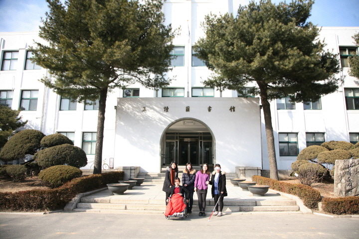 아름다운 정원을 지나 도서관 입구로 들어서니 오늘 체험을 하게 될 친구들이 모여 있었습니다. 선임 기자인 소해준 기자님과 김경은, 임수연, 한윤정 기자님입니다. 김경은 기자님이 휠체어를 타고 지체 장애인 체험을, 임수연 기자님이 안대를 하고 지팡이를 짚으며 시각장애인 체험을 하고 소기자님과 한기자님이 각각 보조 역할을 해주기로 했습니다. 도서관에서는 최영서 실장님이 도서관 시설 안내를 도와주셨습니다.
