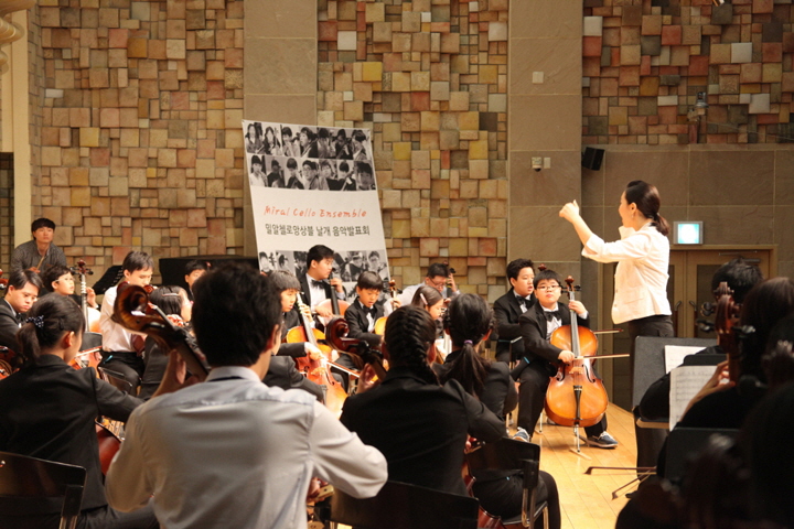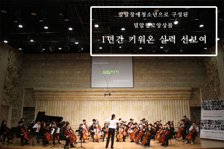 지난 913() 오후 8, 서울 일원동 세라믹팔레스홀에서 진행된 밀알첼로앙상블 날개의 공연. 단원 대부분이 발달장애, 지적장애인인 까닭에 무대 위 아이들의 표정과 자세는 각양각색이었지만 1년간 준비한 연주곡들은 그 어느 연주소리보다 아름다웠습니다.