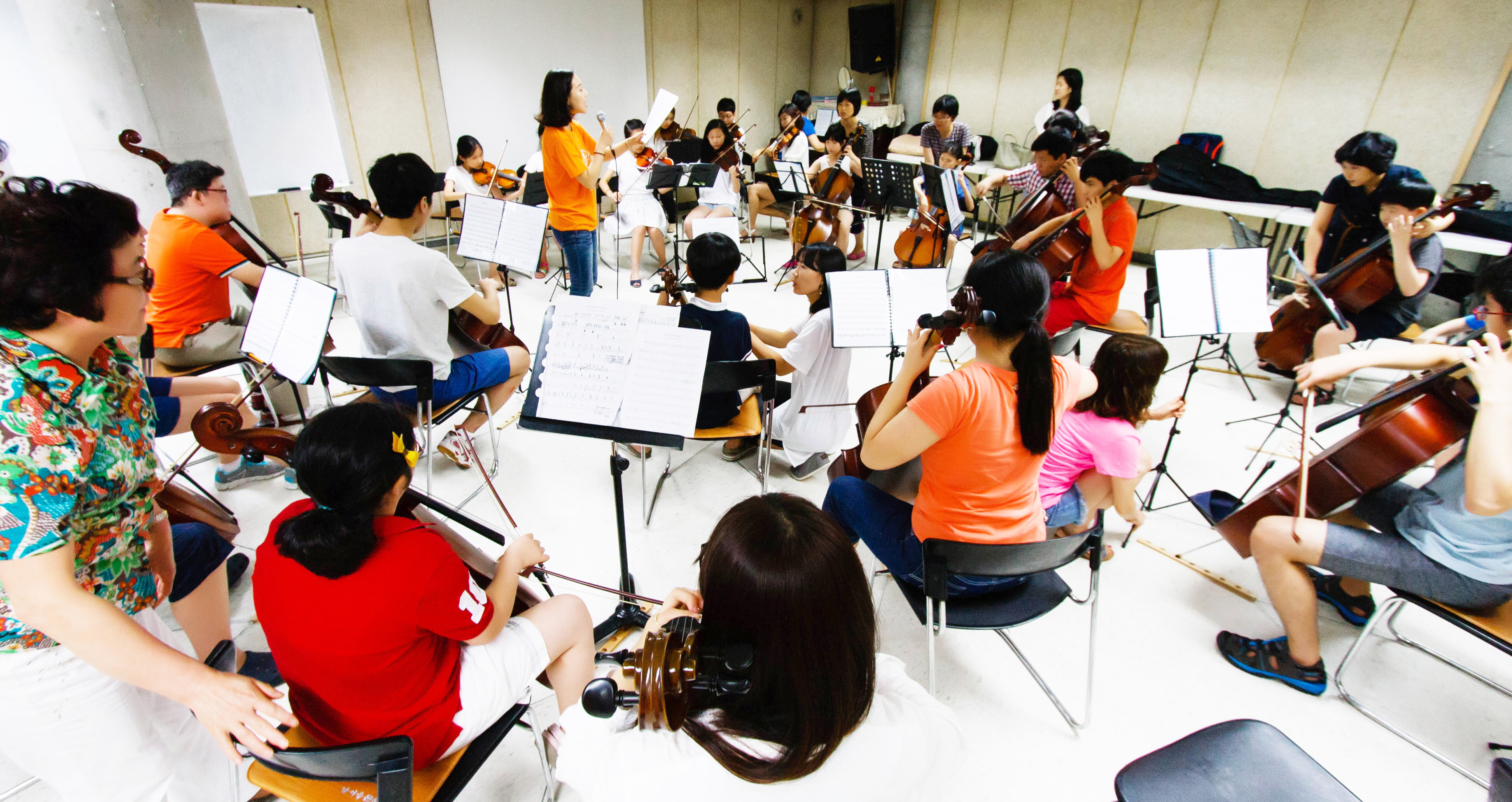 첫 날 밀알아트센터에서 그룹 별 연습을 통하여 연주곡을 연습하고, 청담유스오케스트라와 KU필하모닉 자원봉사자들과 함께 바이올린, 비올라의 악기들과의 협연을 연습하였다.