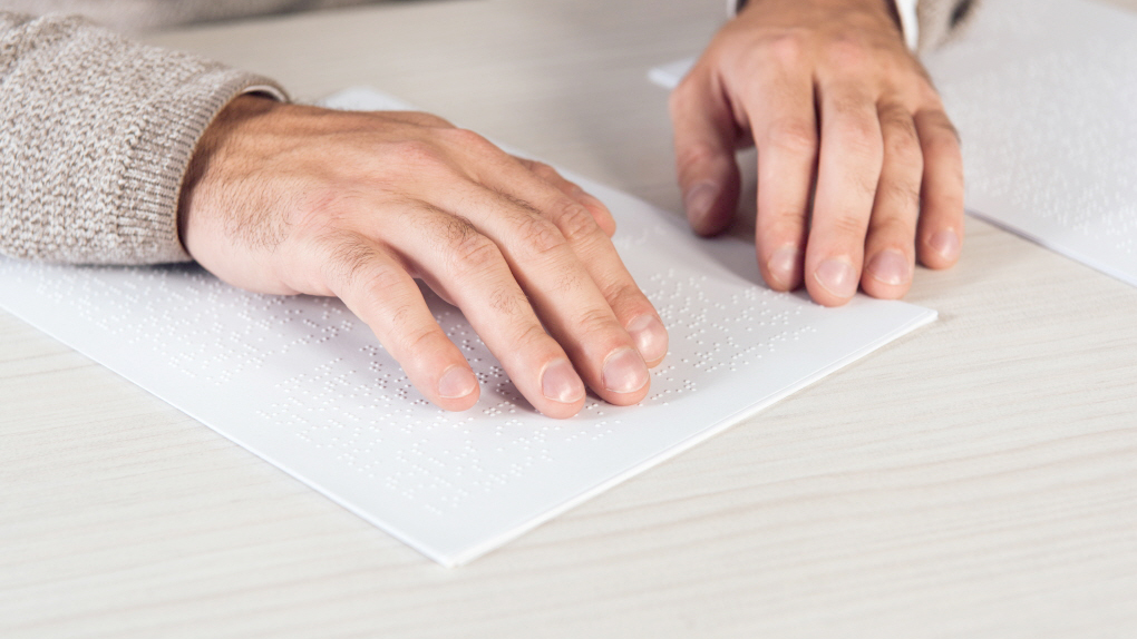 점자책을 읽고 있는 시청각장애인