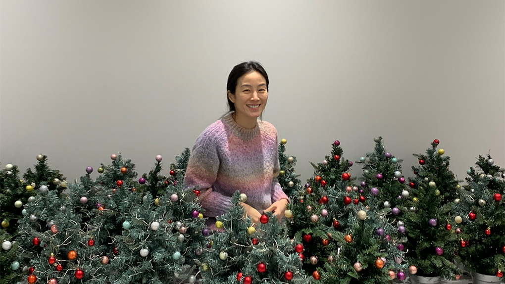 크리스마스 트리 사이에서 웃고 있는 문정원 씨의 모습