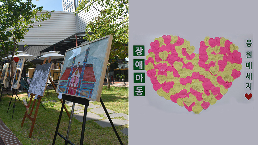 왼: 지난해 8월 대구 시내 중심에서 진행된 장애아동 미술품 전시회