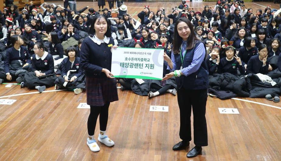 호수돈여자중학교 강당에 모인 전교생 245명은 ‘남을 위해 살자’라는 교훈으로 좀 더 의미 있는 연말을 보내고자 이번 프로그램에 참여하였습니다. 본 프로그램에서 학생들은 해외의 에너지 빈곤국가에서 전기 없이 살아가는 친구들의 삶을 간접적으로 체험하고 태양광랜턴을 직접 조립하고 함께 보낼 희망의 메시지를 작성했습니다.