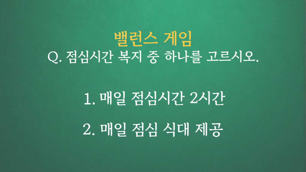 Q. 이쯤에서 밸런스게임 들어갑니다. 직장인에게 가장 소중한 점심시간 복지 질문인데요.