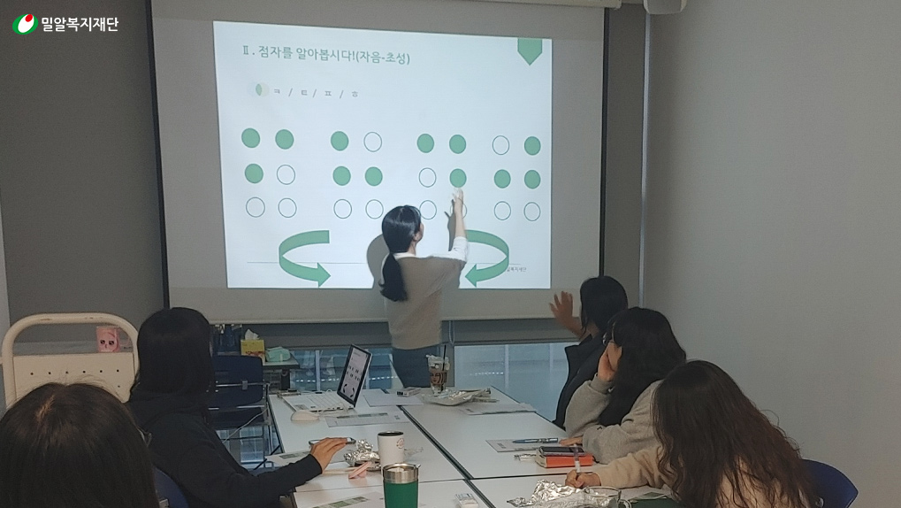 점자 동아리에서 점자 교육을 하고 있는 홍수경 대리