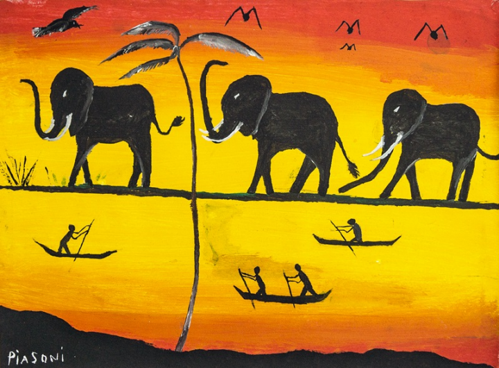 <강과 하늘과 코끼리, 36x26cm, 흰 천에 유채, 2017 ⓒ피아소니 치카쿠다, 말라위>