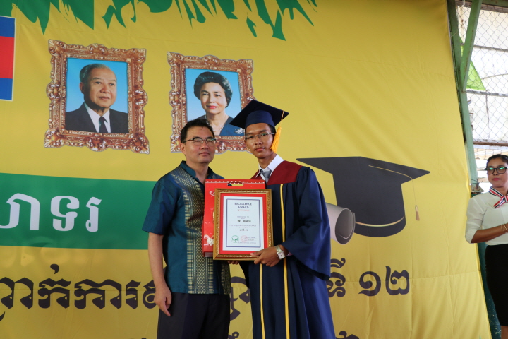 캄보디아는 한국의 수능처럼, 국가에서 치르는 고등학교 졸업시험이 있습니다. 이 졸업시험을 치르는 학생의 40%이상이 기준 점수를 통과하지 못해 F등급을 받는다고 합니다. F등급을 받게 되면, 정부에서 인정하는 졸업장이 아닌 수료증이 발급됩니다. F등급을 받으면 정규대학에 응시할 수 없고 1년 후에 다시 재시험을 봐야 합니다. 시험에서 A등급을 받는 것은 기적에 가깝습니다. 올해 약 9만 5천명이 고등학교 졸업시험에 응시하였는데, 9만 5천명의 학생 중에서 450명만이 A등급을 받았습니다. 그런데, 희망학교 2회 졸업생인 ‘리읍까니까’라는 학생이 전체 석차 56등으로 A등급 받은 것입니다. 전국에서 A등급을 받은 학생이 한명도 없는 지역이 3곳이나 있을 정도이니, 놀라운 일입니다.