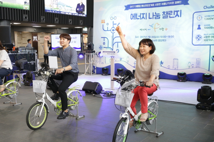 밀알복지재단은 지난 26일, SRT 수서역에서 한국에너지공단, ㈜에스원, ㈜SR과 함께 에너지 소외계층의 시원한 여름나기를 지원하는 ‘에너지 나눔 챌린지’를 개최했습니다. 작년에 이어 올해로 2회를 맞은 ‘에너지 나눔 챌린지’는 시민들이 자전거 발전기를 돌려 목표 전력 1,000W를 생산해내면 밀알복지재단과 한국에너지공단, ㈜에스원의 지원으로 에너지 소외계층에게 여름나기 키트를 전달하는 시민 참여형 행사입니다.