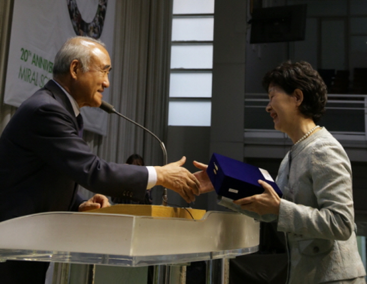 밀알학교에서 20년간 꾸준히 봉사화동을 해 온 김영희씨에게 감사패를 전달하는 홍정길 이사장