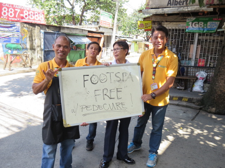 미용기술(매니큐어, 패디큐어, 핸드스파, 풋스파, 헤어컷)을 익히기 위해서는 많은 실습 대상자가 필요합니다. 교실에 마냥 앉아 실습대상자를 기다릴 수는 없습니다. 이들은 실습대상자를 찾아 ‘무료 매니큐어, 패디큐어’라고 쓰여 진 보드를 들고 적극적으로 지원자를 찾아 나섭니다. 부끄러워하기는커녕 길거리 호객 행위를 하는 다른 사람들처럼 손짓과 몸짓에서 자신감이 배어나옵니다. 이웃 주민들은 공짜로 관리를 받을 수 있어 좋고, 미용교육 학생들은 배운 것을 실습할 수 있어 누이 좋고 매부 좋은 격입니다. 다들 장애인은 봉사의 대상이 되어야 한다고 생각하지만, 필리핀 마닐라 사업장, 특히 이곳 미용교육실에서 그런 이야기는 더 이상 통하지 않는 것 같습니다. 많은 사람들이 교육실 학생들의 손을 거쳐 갈수록 학생들의 미용기술은 더욱 향상되고, 더불어 이웃들이 가진 장애에 대한 편견도 사라질 것입니다.