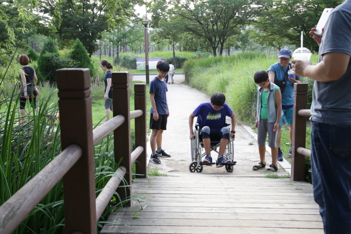 활동에 참여하고 있는 한 가정은 조사활동을 위해 직접 휠체어를 구입했다. 이 휠체어 덕분에 가족들 모두가 장애인이 마주하는 수많은 어려움을 직접 경험할 수 있었다. 보라매공원은 휠체어가 다니기에 잘 정돈되어 있지만, 군데군데 야트막이 턱이 있어 수동휠체어를 이용하는 장애인이 혼자 이동하기에 어려운 장소가 있다. 부모님과 아이들은 그 공간에 멈춰 서서 번갈아가며 턱을 넘는 체험을 했다.