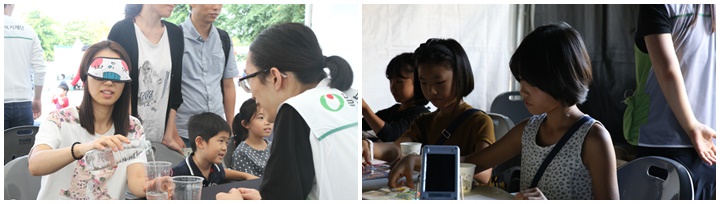 보이지 않는 상태에서 물따르기(왼쪽)와 어둠속에서 그림 그려보기(오른쪽)
