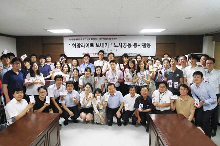 지난 8월 24일(수), 한국에너지기술평가원과 밀알복지재단 ‘라이팅칠드런 희망랜턴 보내기’ 캠페인을 통해 태양광랜턴 만들기 임직원봉사활동을 진행했습니다. 에너지기술이라는 업무의 특성에 맞게 ‘에너지’로 ‘나눔’을 실천할 수 있는 희망랜턴 보내기에 함께하게 되었습니다.
