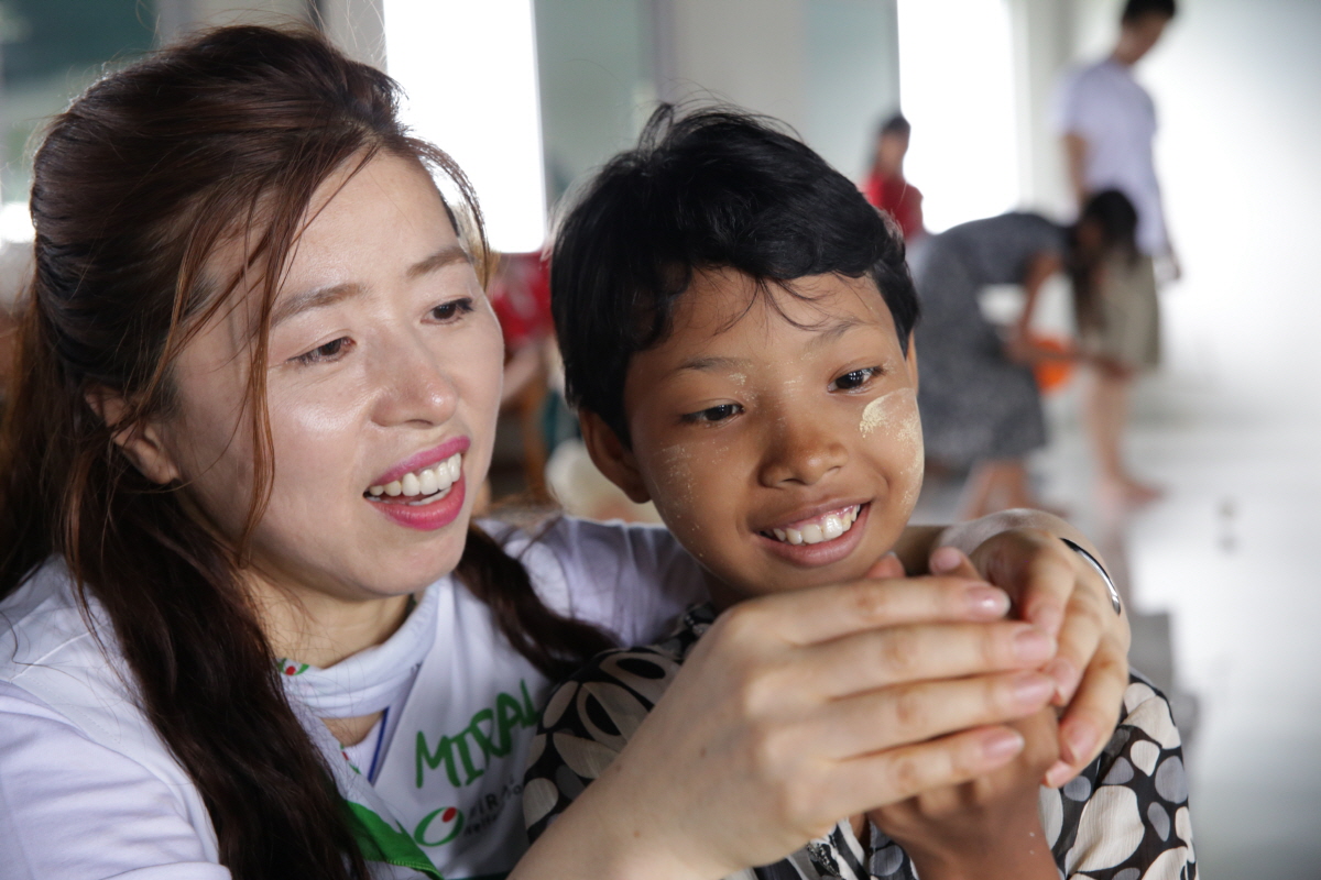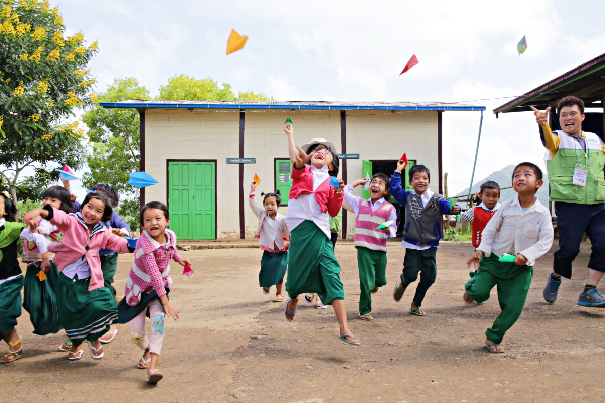 어릴 적부터 미술과 태권도, 피아노 등 예·체능 수업이 일상적인 우리나라와는 달리, 미얀마는 사립학교 외엔 예·체능 수업을 받기 어렵습니다. 그런 아이들을 위해 회원님들이 준비한 활동은 색종이와 비누클레이를 활용한 만들기 수업과 팽이치기, 림보 게임 등의 체육 활동들. 쑥스러움도 잠시, 회원님들은 동심으로 돌아간 것처럼 몸을 힘껏 날려 바람 속에 비행기를 날려보기도 하고, 아이들과 함께 ‘곰 세 마리’의 율동을 따라 하기도 합니다. 아이들은 그런 선생님들의 모습이 즐거운 걸까요? 아니면 색종이로 만든 새로운 장난감이 생긴 것이 기쁜 걸까요? 수업이 진행되는 체육관 내에는 아이들의 웃음소리가 끊이지 않았습니다. 너무나도 즐거워하는 아이들 모습에, 아이들에게 행복한 추억 하나를 선물해 준 것 같아 회원님들의 마음도 뿌듯해집니다.
