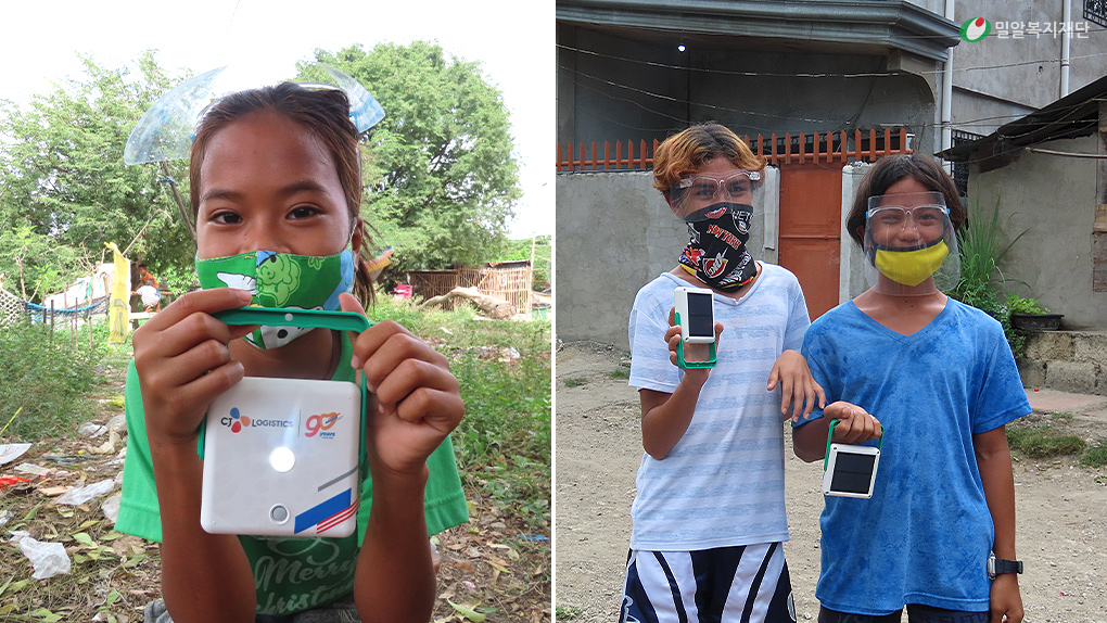 학교를 갈 수 없는 아이들은 주1회 지급되는 모듈(학습지)로 집에서 혼자 학습해야 했습니다. 그러나 빈곤 가정의 아이들은 낮 시간에 부모님의 집안일을 돕거나 동생들을 돌보느라 캄캄한 밤이 되어서야 공부를 할 수 있었습니다. 하지만 전기 공급이 되지 않는 가정의 아이들은 책을 읽을 수 없는 현실에 놓여있었습니다. 이에 필리핀 세부 사업장은 아이들이 꿈을 잃지 않고 학업을 지속할 수 있도록 담사이트, 이바바오 지역 아동청소년 850가정에 태양광랜턴을 지원했습니다.