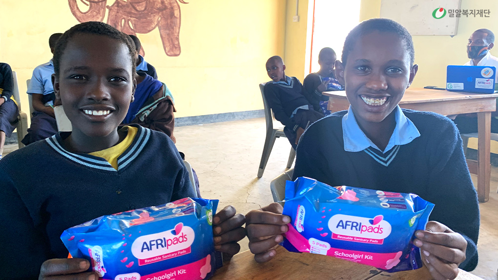 깨끗한 물이 부족하여 면 생리대를 세탁해 사용할 수 없는 지역의 아이들에게는 일회용 생리대 지원했습니다. 이를 통해 아이들이 2차 성징 시기에 위생적이고 올바르게 스스로의 건강을 지킬 수 있도록 하였습니다. 생리대를 받은 아이들의 입가에는 미소가 번지기 시작하였습니다.