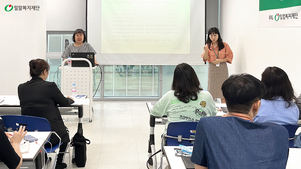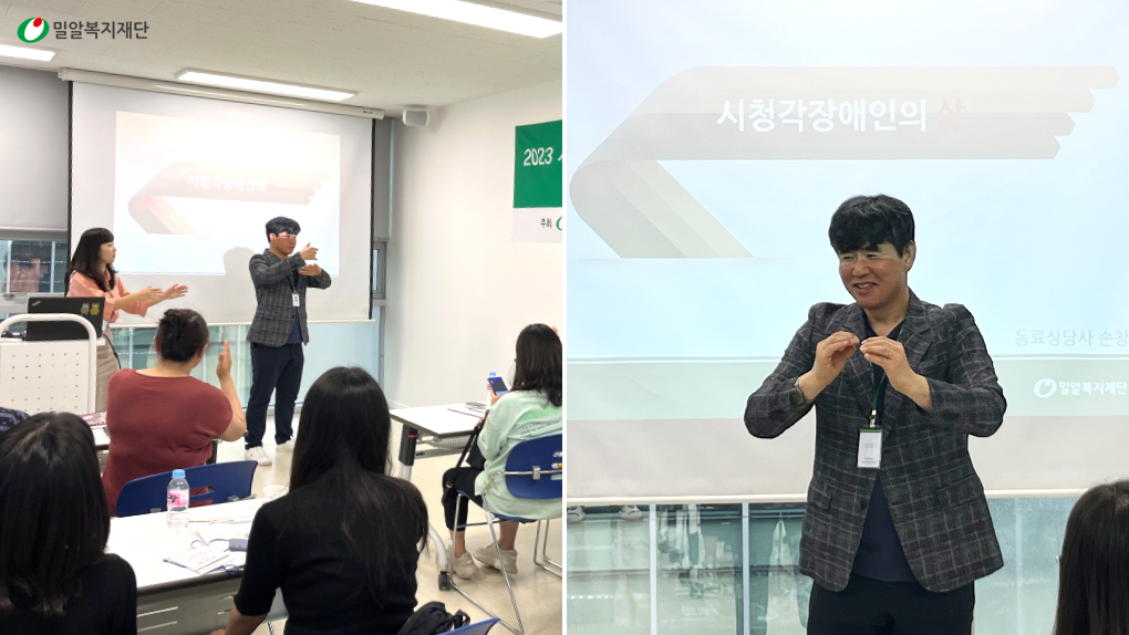 먼저 시청각장애인에 대한 일반적인 정의와 유형, 욕구, 의사소통 등을 알아보기 위해 밀알복지재단 홍유미 헬렌켈러센터 센터장의 강의가 시작되었습니다. 이어서 손창환 시청각장애인 동료상담사의 ‘시청각장애인의 삶’, 김용재 시청각장애인 동료상담사의 ‘점자 배우는 과정’을 통해 시청각장애인의 실제 사례를 소개하는 시간을 가졌습니다.