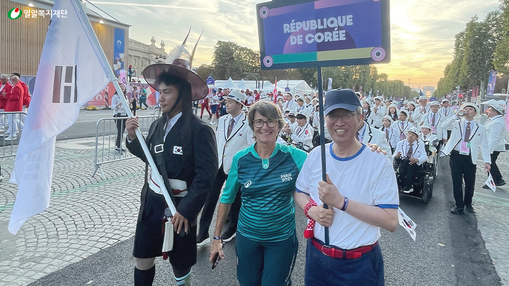 2024 파리 패럴림픽 대한민국 선수단 입장의 기수로 참여한 밀알복지재단 정형석 상임대표(우측)