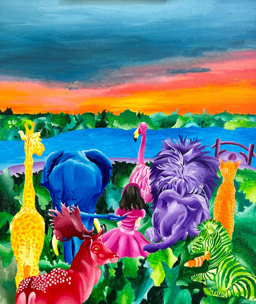 분홍 홍학, 빨간 사슴, 노란 기린, 파란 코끼리, 초록 얼룩말, 보라 사자까지…