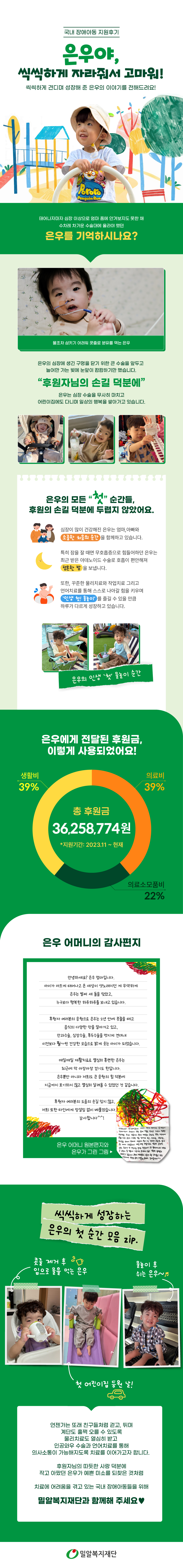 아이들의 삶을 바꾸는 소액기부 아이들의 삶을 바꾸는 소액기부 [지원후기] 은우야, 씩씩하게 자라줘서 고마워! [지원후기] 은우야, 씩씩하게 자라줘서 고마워! 정기소식지 'The Miral' 92호 정기소식지 'The Miral' 92호 2024 연차보고서 e-book 2024 연차보고서 e-book
